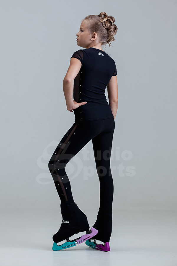 Классическая модель прилегающего силуэта с коротким втачным рукавом «сетка», вырез горловины круглый, боковые вставки из сетки декорированы стразами.
