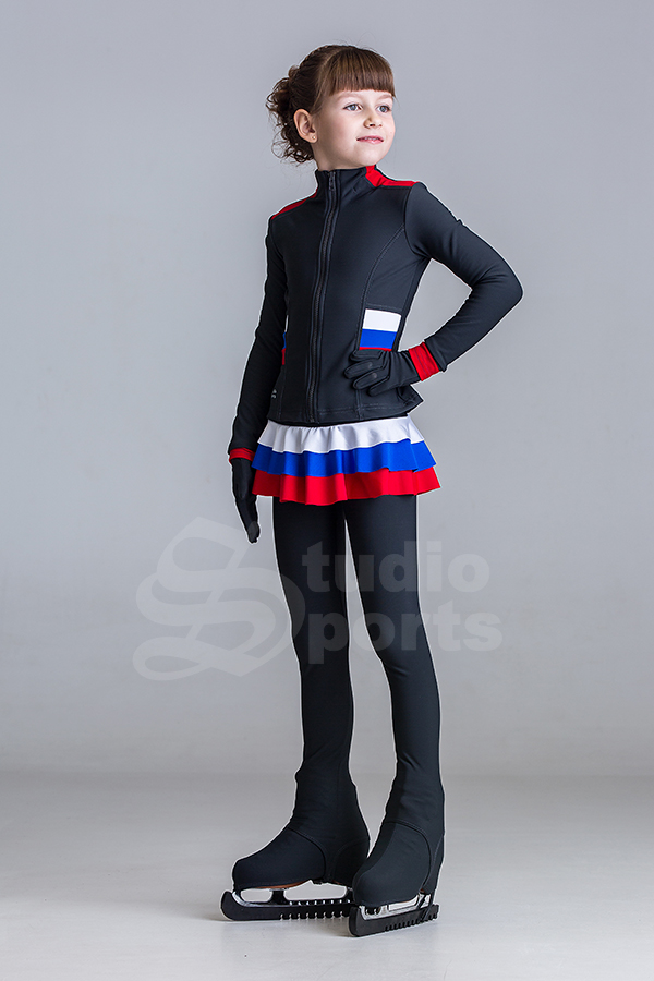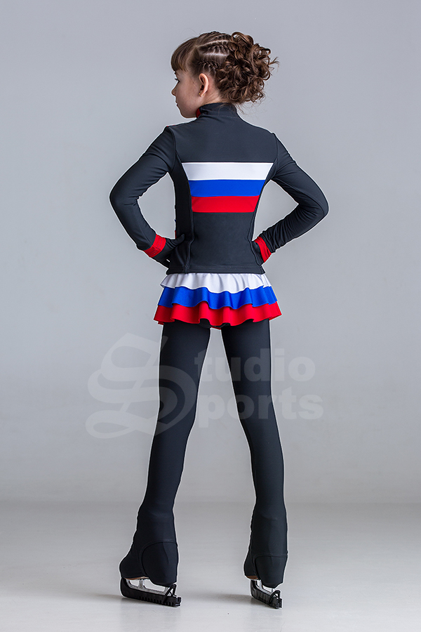 Комплект состоит из термо куртки с втачными рукавами, цельнокроеным воротником-стойкой, застёжкой молния в цвет основной ткани, термо юбки с воланами в цвет отделочных элементов куртки, термо лосины дополняют целостность ансамбля. Кульминационным элементом в костюме является патриотическое сочетание цветов, расположенных не только на полочках, но и на спинке. Данная модель практична в применении, так как возможны различные варианты её комбинации.