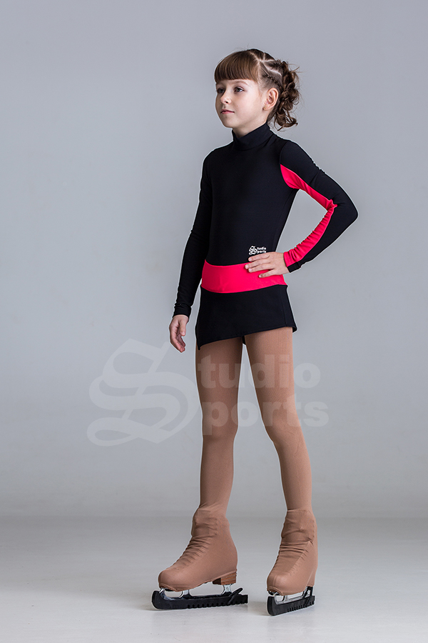 Контрастная расцветка, широкий пояс соединяющий лиф с юбкой, необычная вставка на рукаве всё это делает образ оригинальным для тренировок и для Ваших первых соревнований.