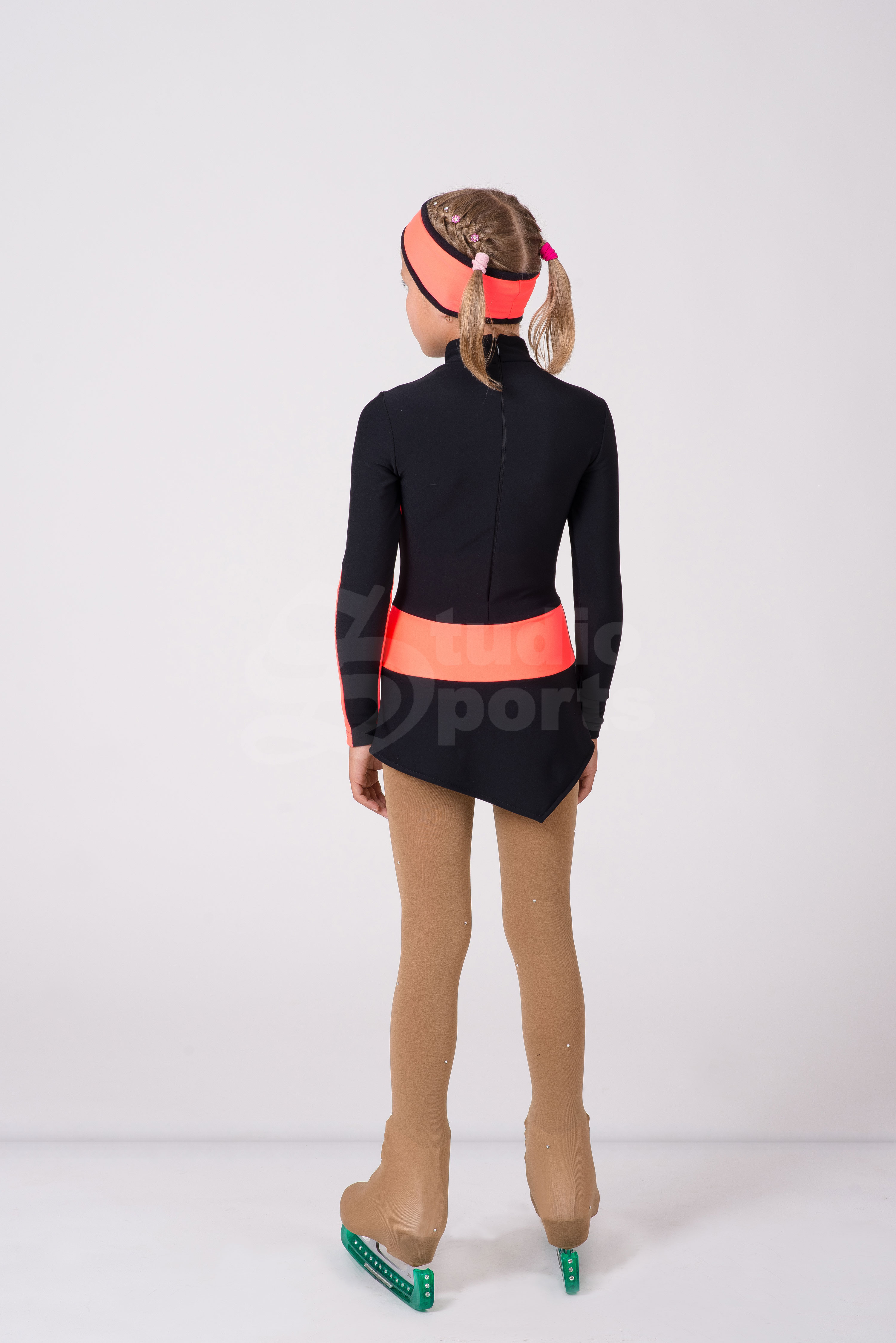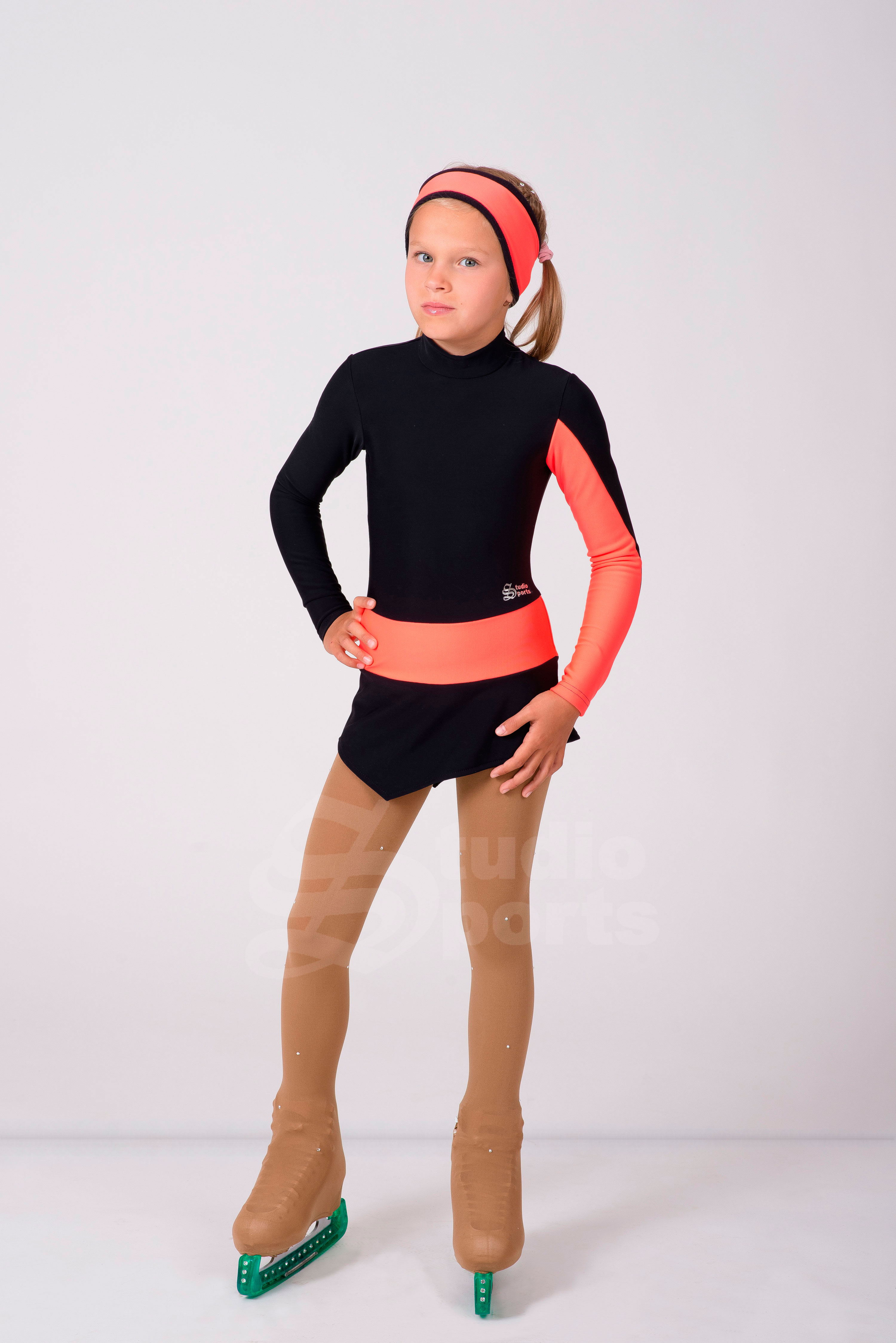 Контрастная расцветка, широкий пояс соединяющий лиф с юбкой, необычная вставка на рукаве всё это делает образ оригинальным для тренировок и для Ваших первых соревнований.