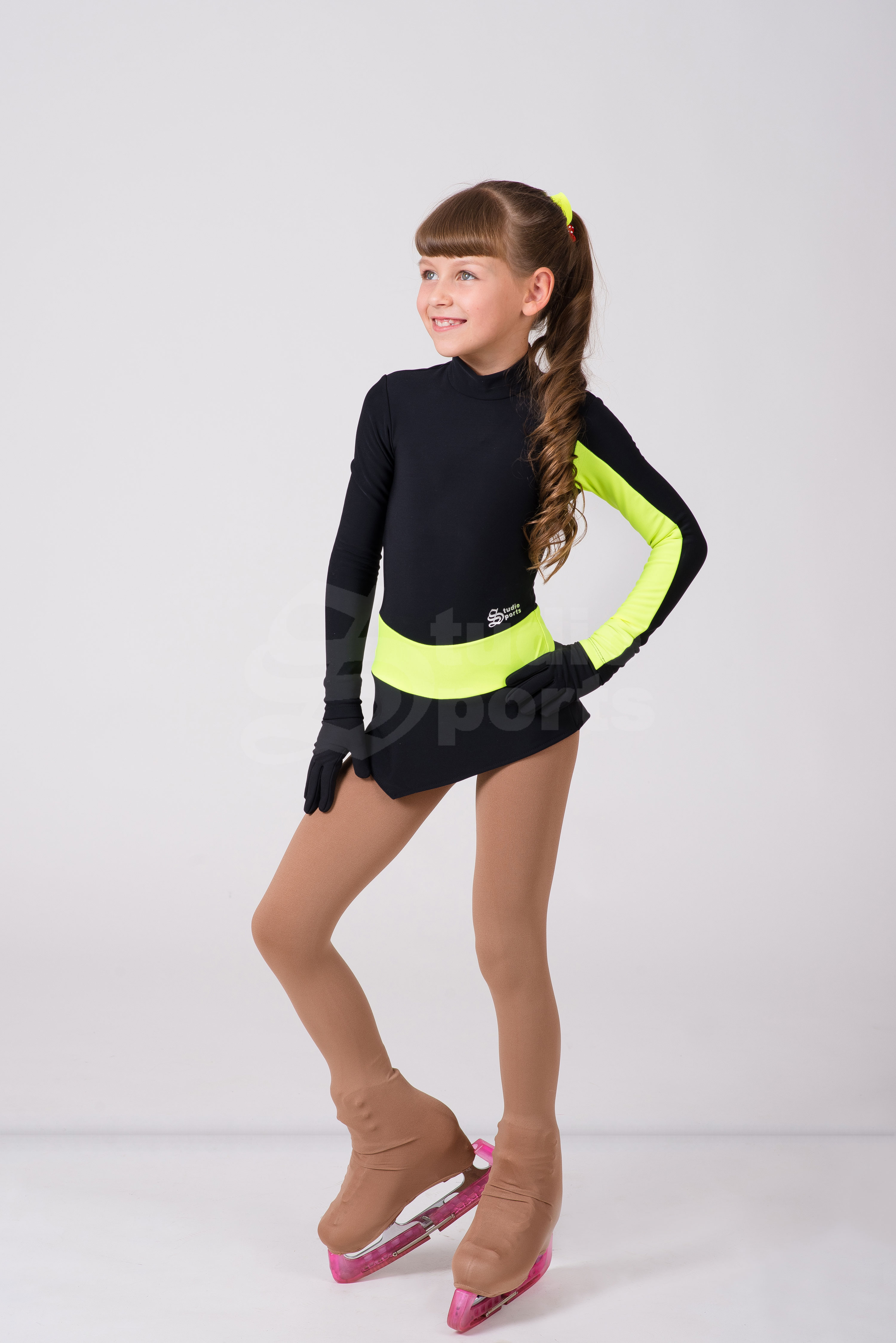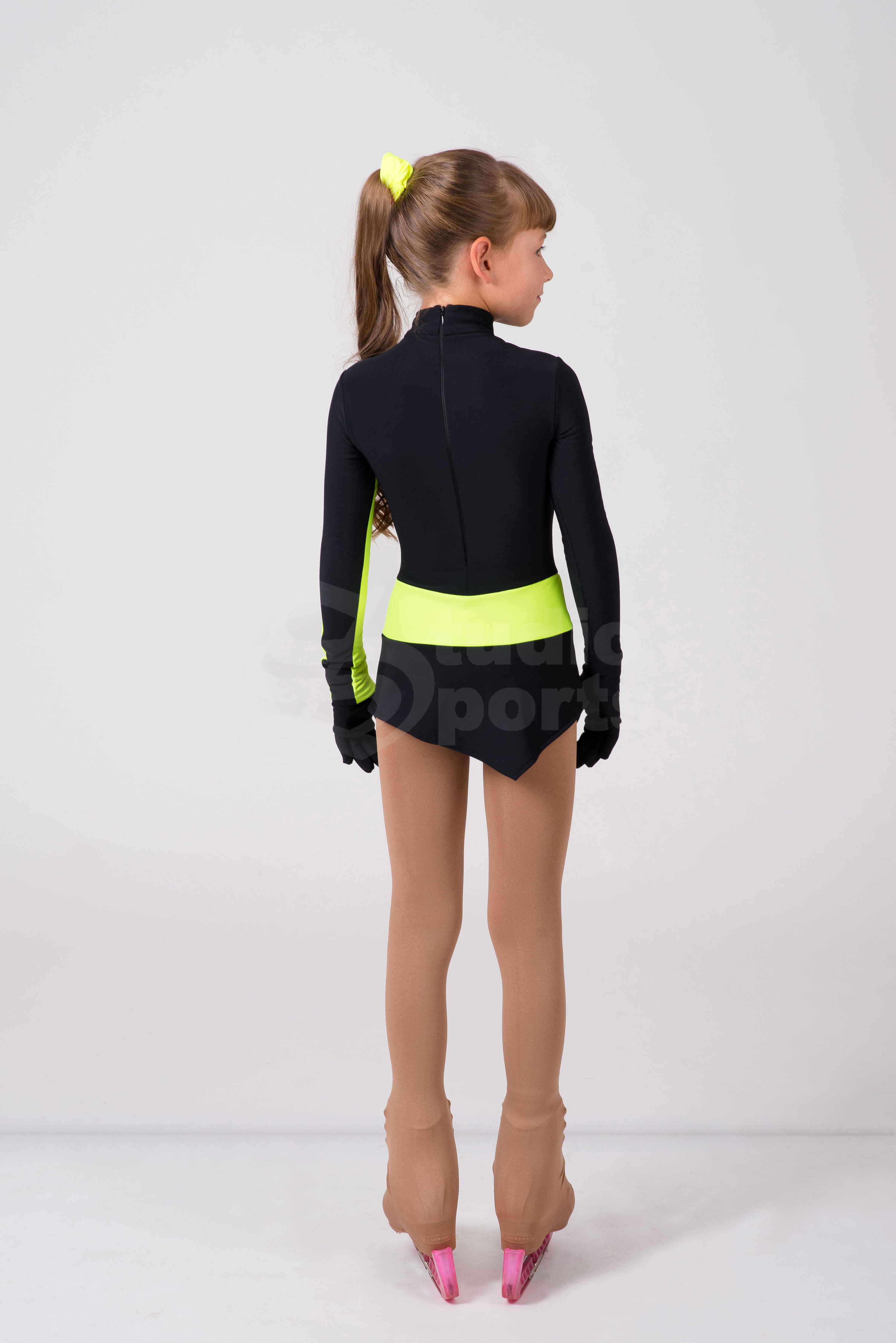 Контрастная расцветка, широкий пояс соединяющий лиф с юбкой, необычная вставка на рукаве всё это делает образ оригинальным для тренировок и для Ваших первых соревнований.