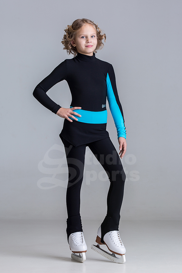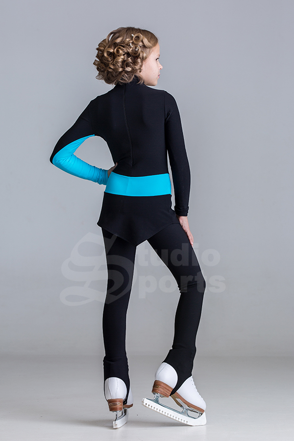 Контрастная расцветка, широкий пояс соединяющий лиф с юбкой, необычная вставка на рукаве всё это делает образ оригинальным для тренировок и для Ваших первых соревнований.