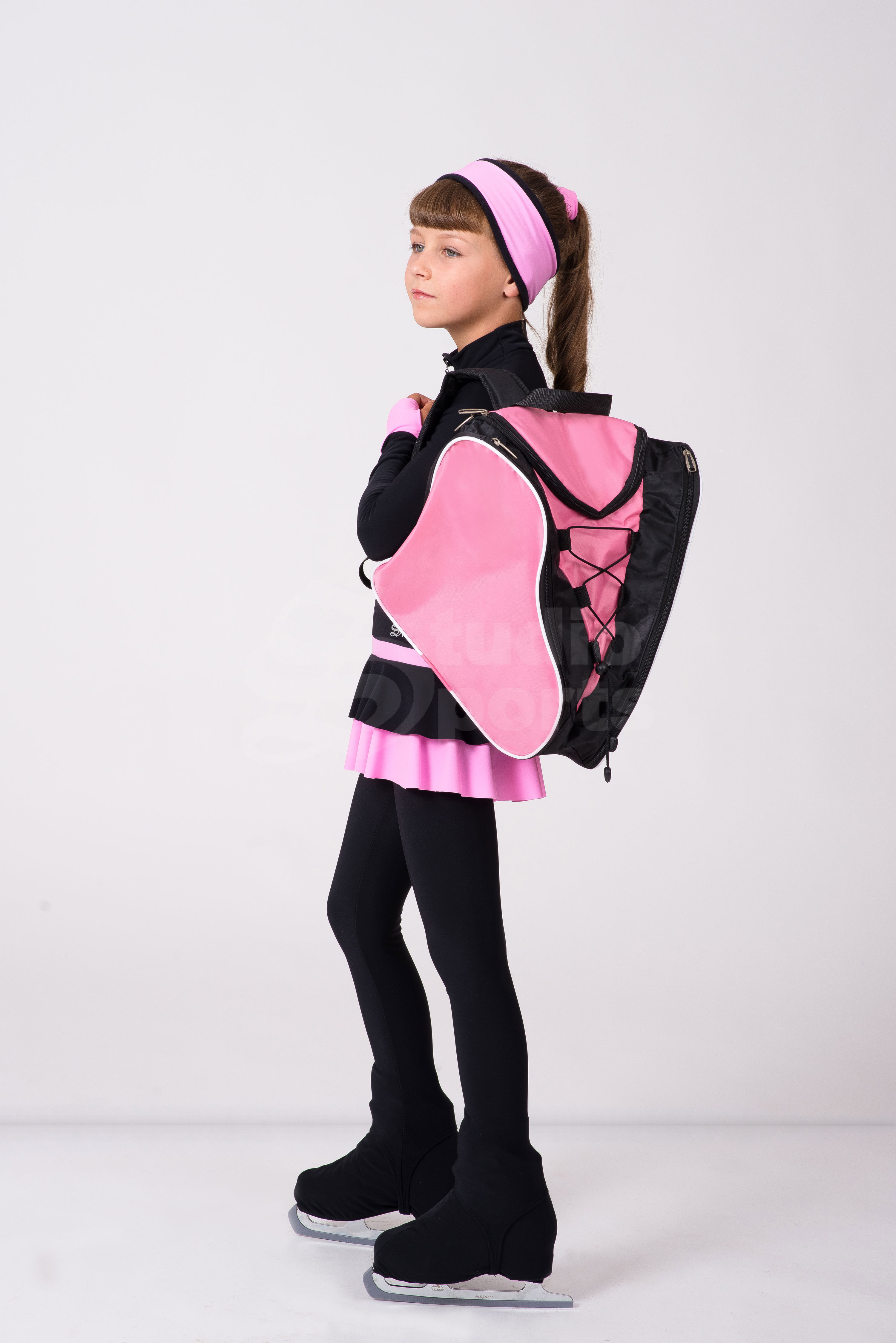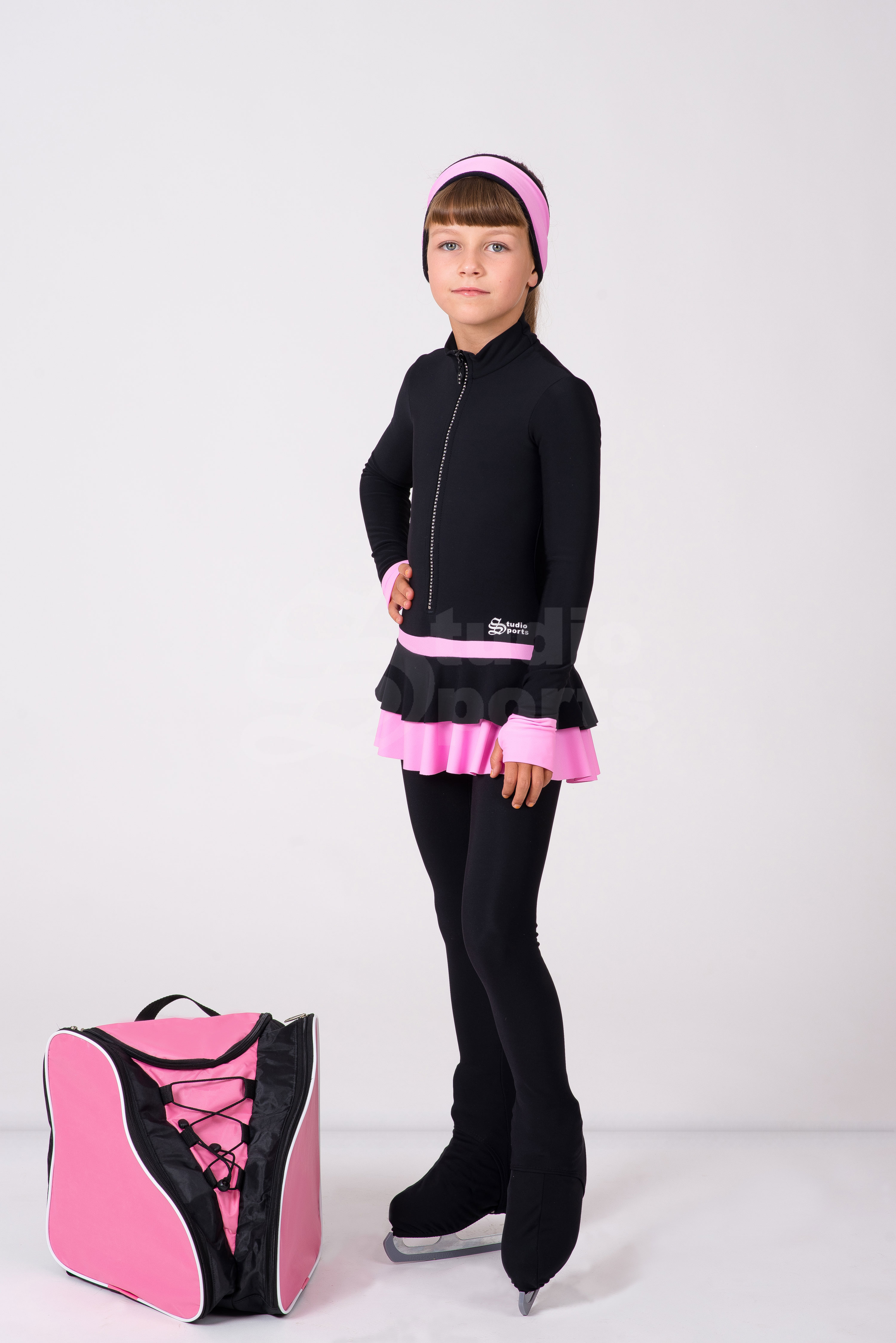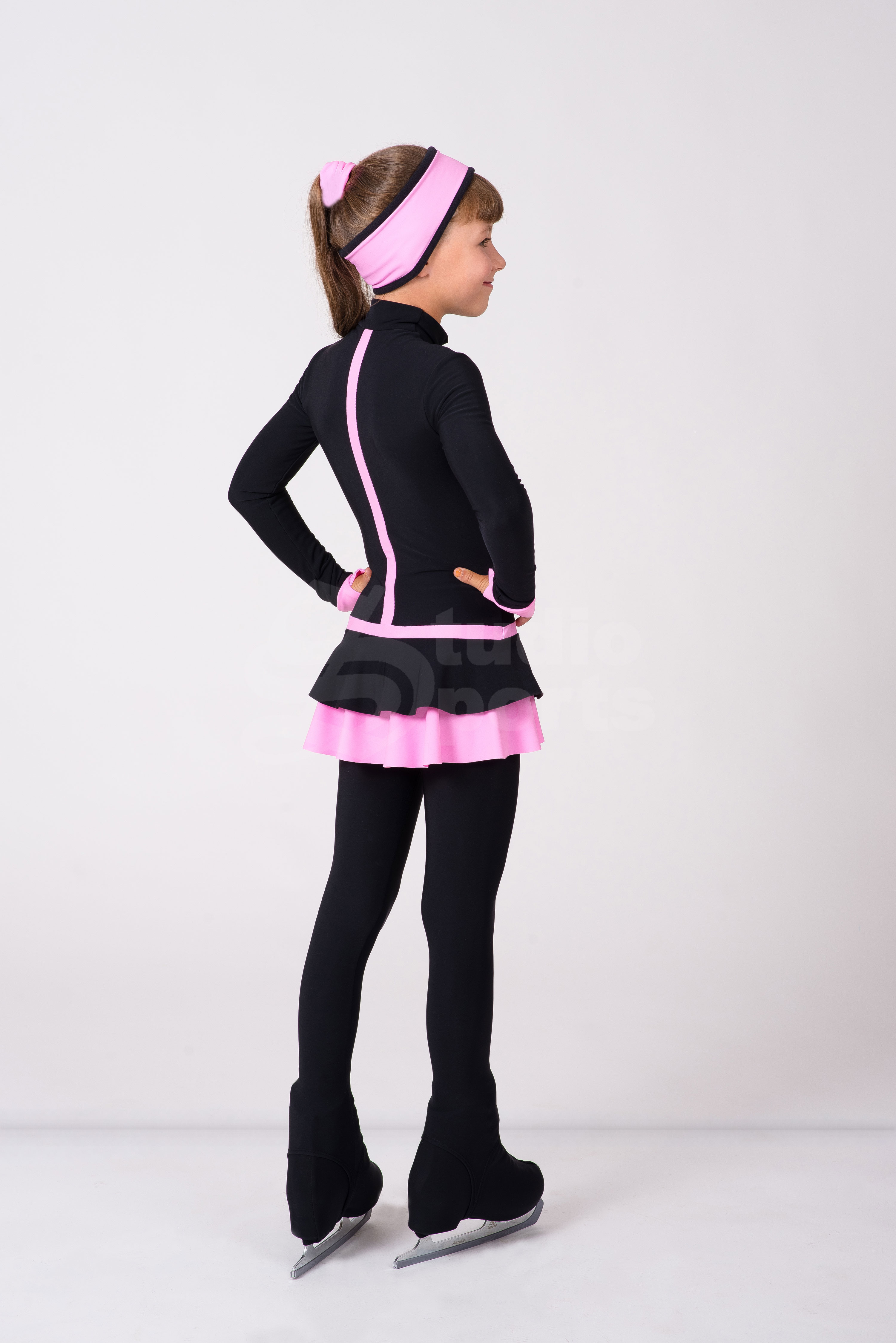 Чёрные термо лосины и повязка на голову делают образ законченным и удобным для тренировок. Возможное разнообразие цветовых решений, поможет подчеркнуть индивидуальность юной фигуристки.