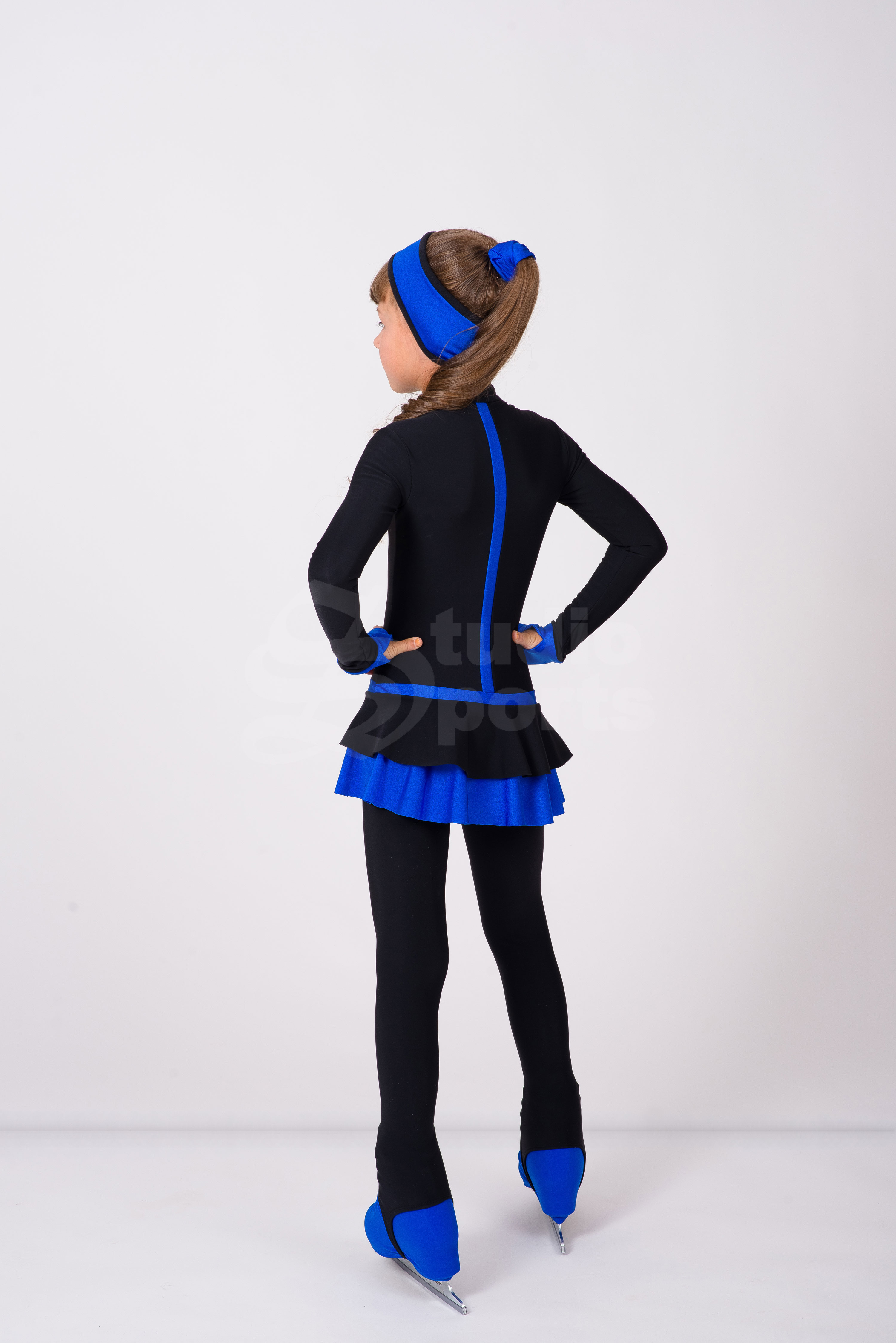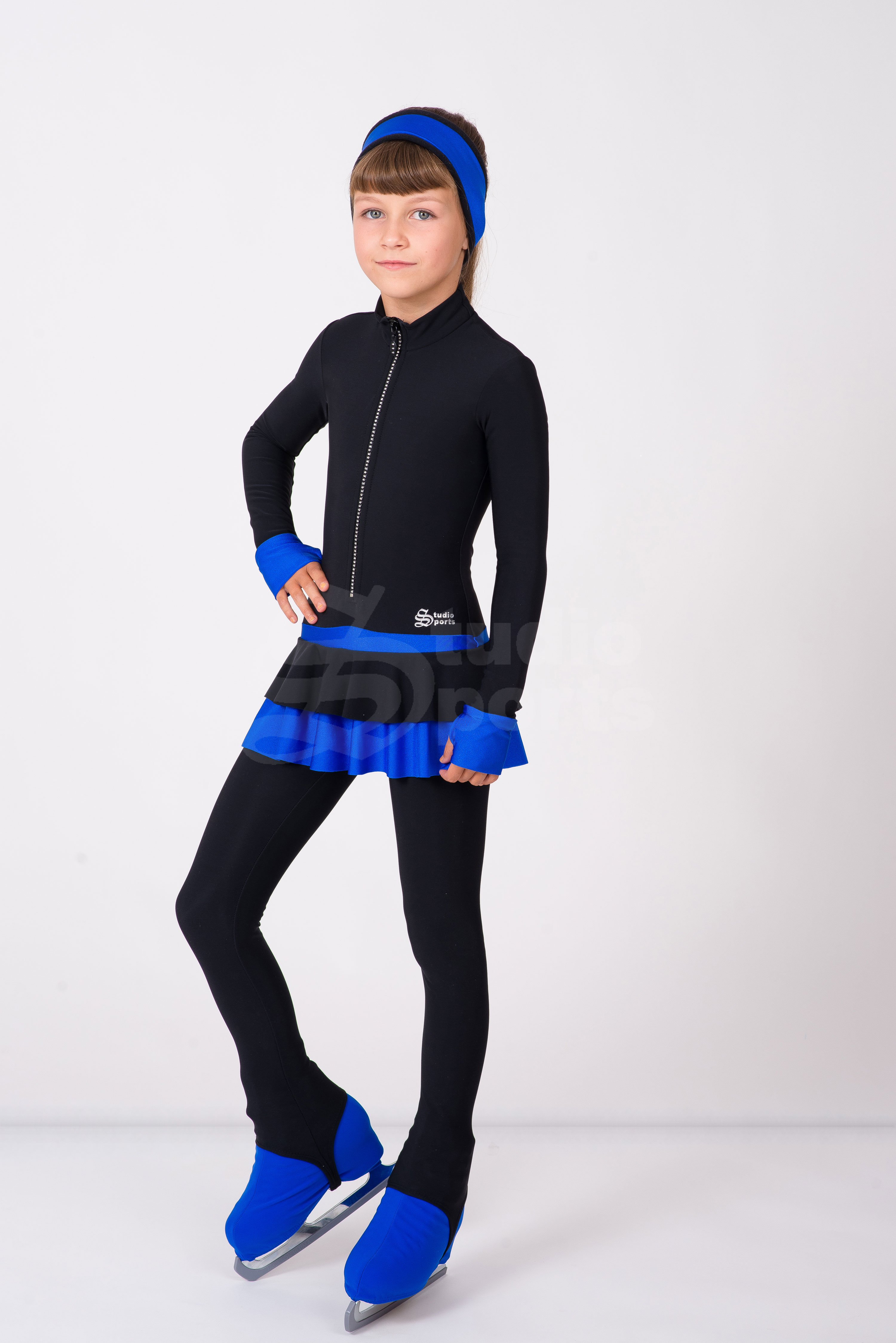 Чёрные термо лосины и повязка на голову делают образ законченным и удобным для тренировок. Возможное разнообразие цветовых решений, поможет подчеркнуть индивидуальность юной фигуристки.