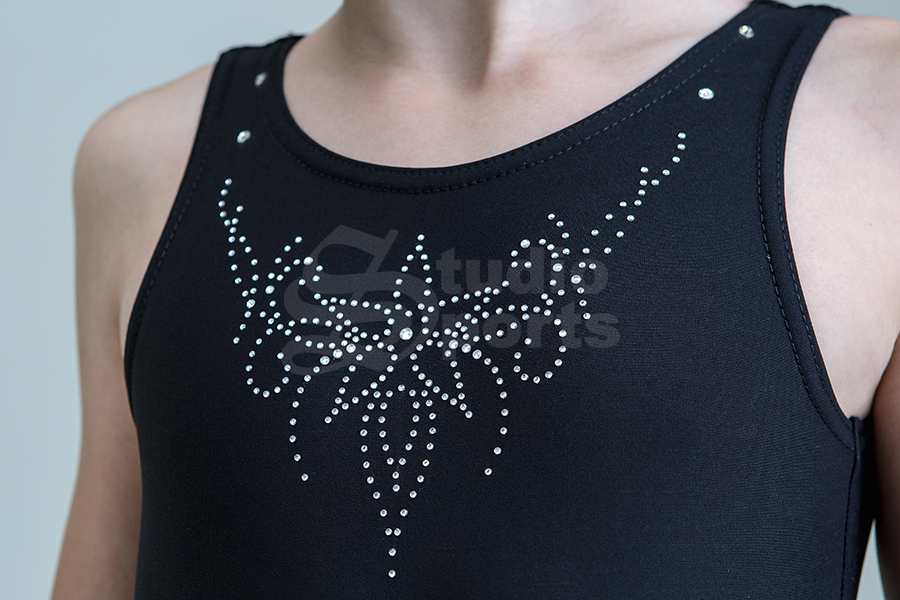 Лиф платья украшен термо наклейкой из стразов «Колье». Более крупные стразы украшают юбку платья и кокетливый вырез на спинке.