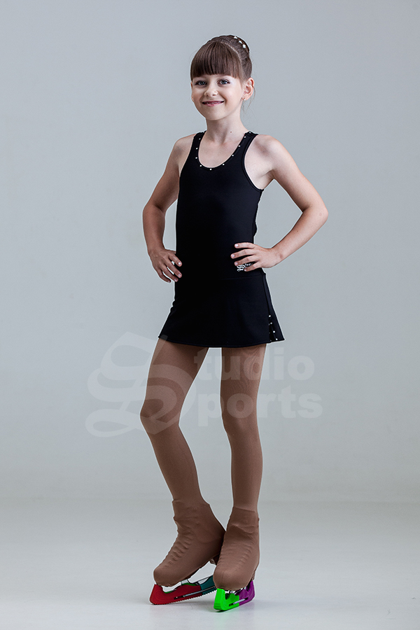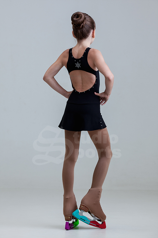 Дерзкий вырез на спинке, также украшенной стразами, притягивает взгляды и придает уверенность будущей фигуристке.